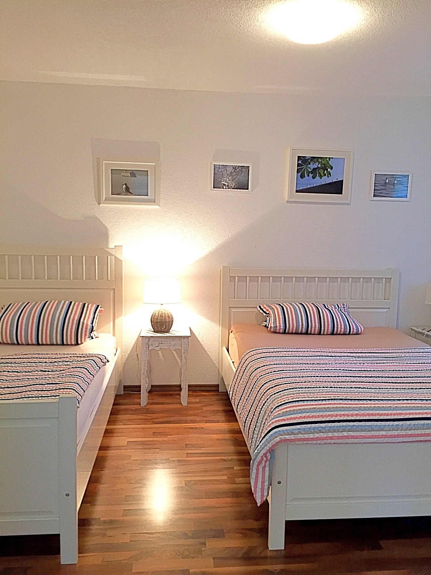 Unsere 90m² große, gemütliche Nichtraucher Ferienwohnung, erstreckt sich über das gesamte Erdgeschoss. Sie verfügt über 2 separate Schlafzimmer mit je einem Doppelbett.
